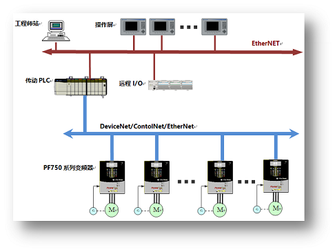 通過DeviceNet/ContolNet/EtherNet網(wǎng)絡(luò)組態(tài) ,實現(xiàn)PLC對PowerFlex 750變頻器的完全控制和狀態(tài)監(jiān)視;